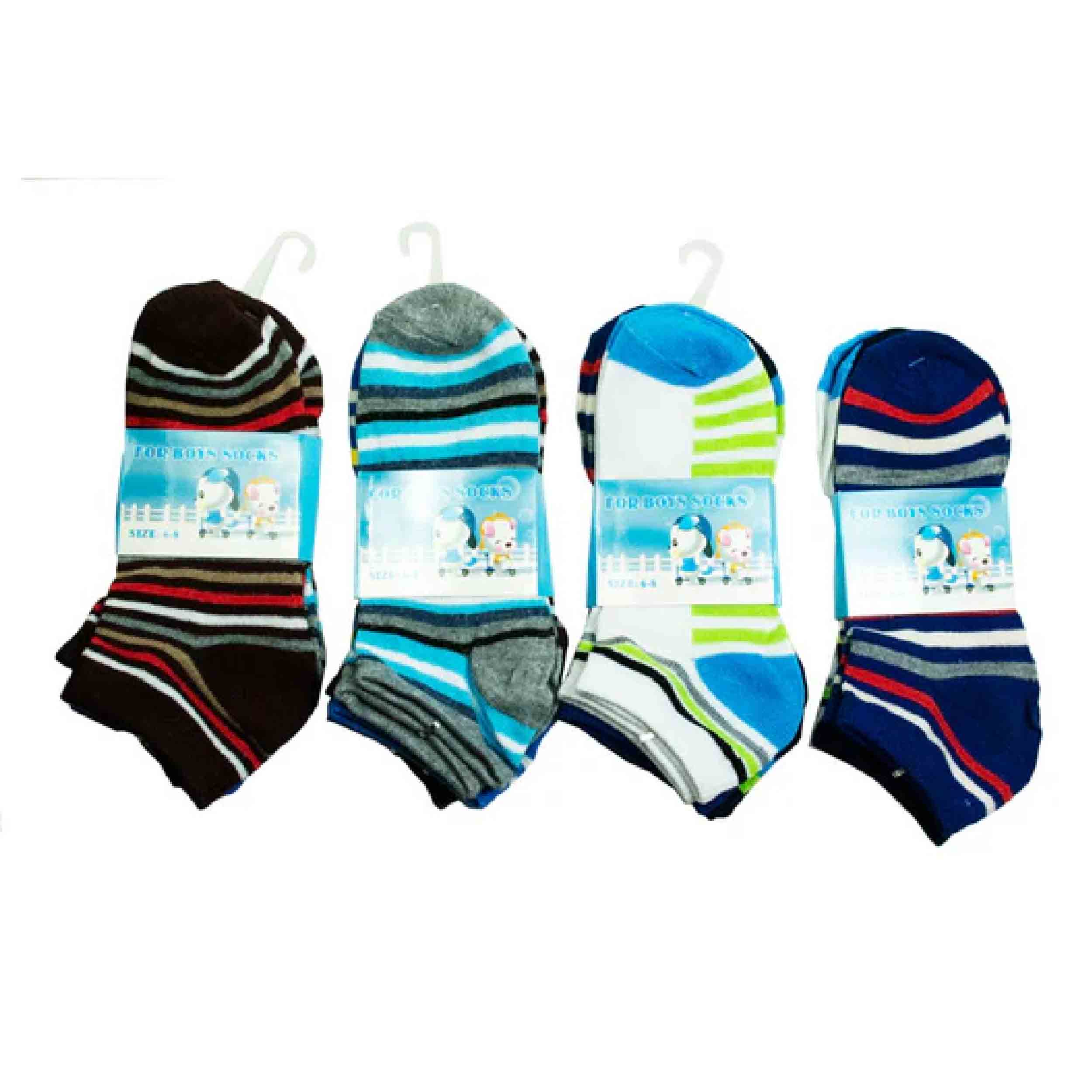 Bring a touch of fun and comfort to his wardrobe with our Boy's Stripe Ankle Socks. These ankle cotton socks feature vibrant stripe designs, making them perfect for everyday wear or as part of school uniforms. Crafted from a blend of 80% cotton and 20% spandex, these socks offer a comfortable fit with just the right amount of stretch. Each pack includes a dozen socks in assorted colors and designs, providing variety for his daily outfits. Available in a pack of 3 pairs, these socks are conveniently displayed on a hook for easy presentation in retail settings. Whether for casual wear or school activities, these socks are sure to keep him comfortable and stylish all day long.