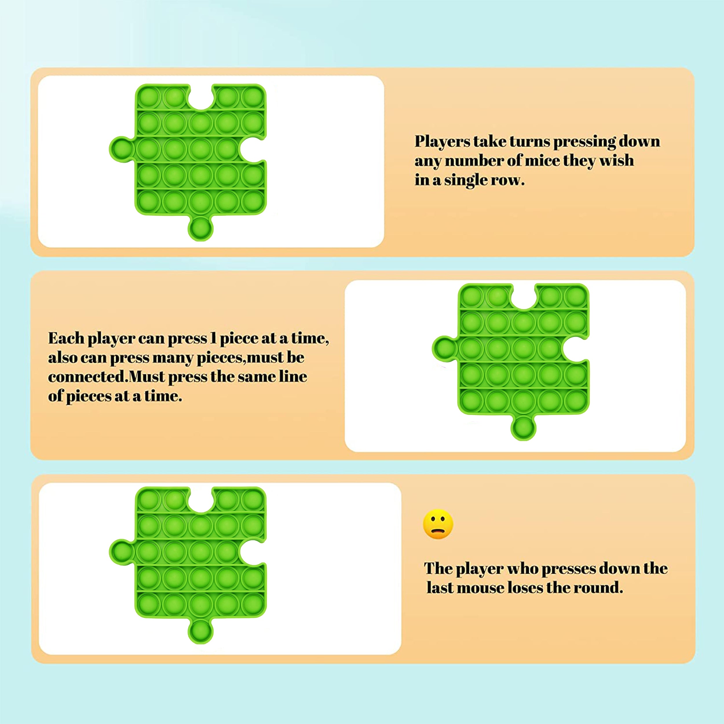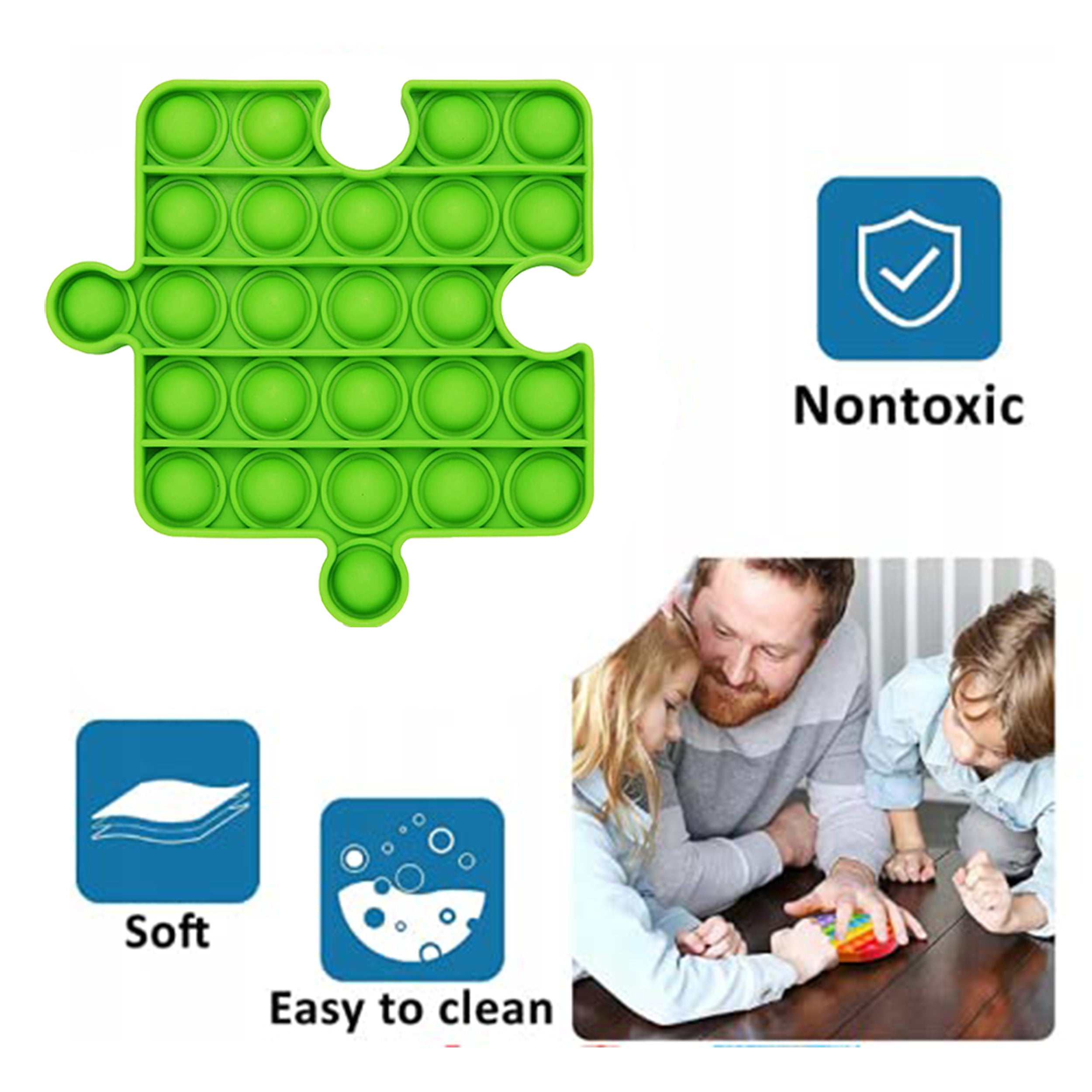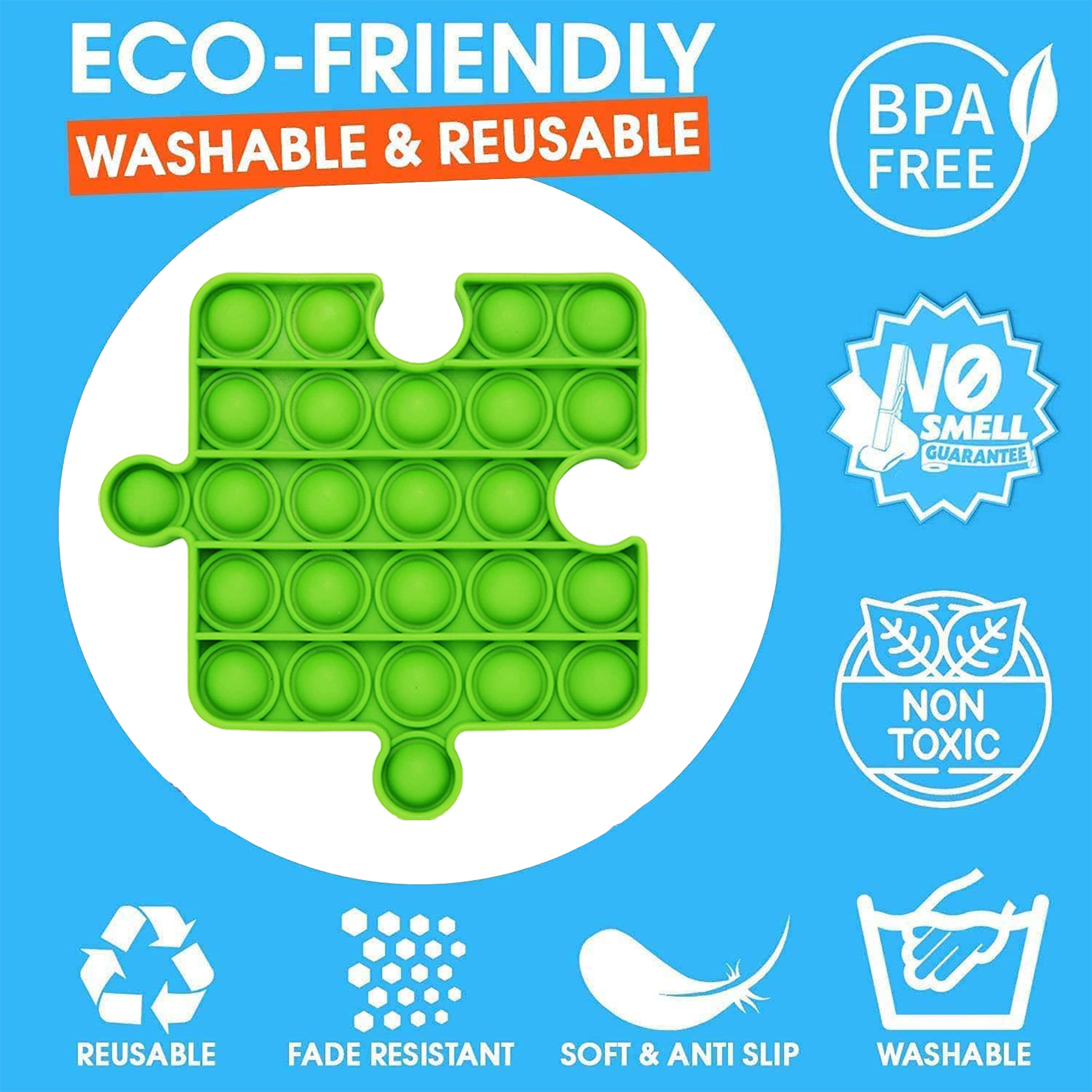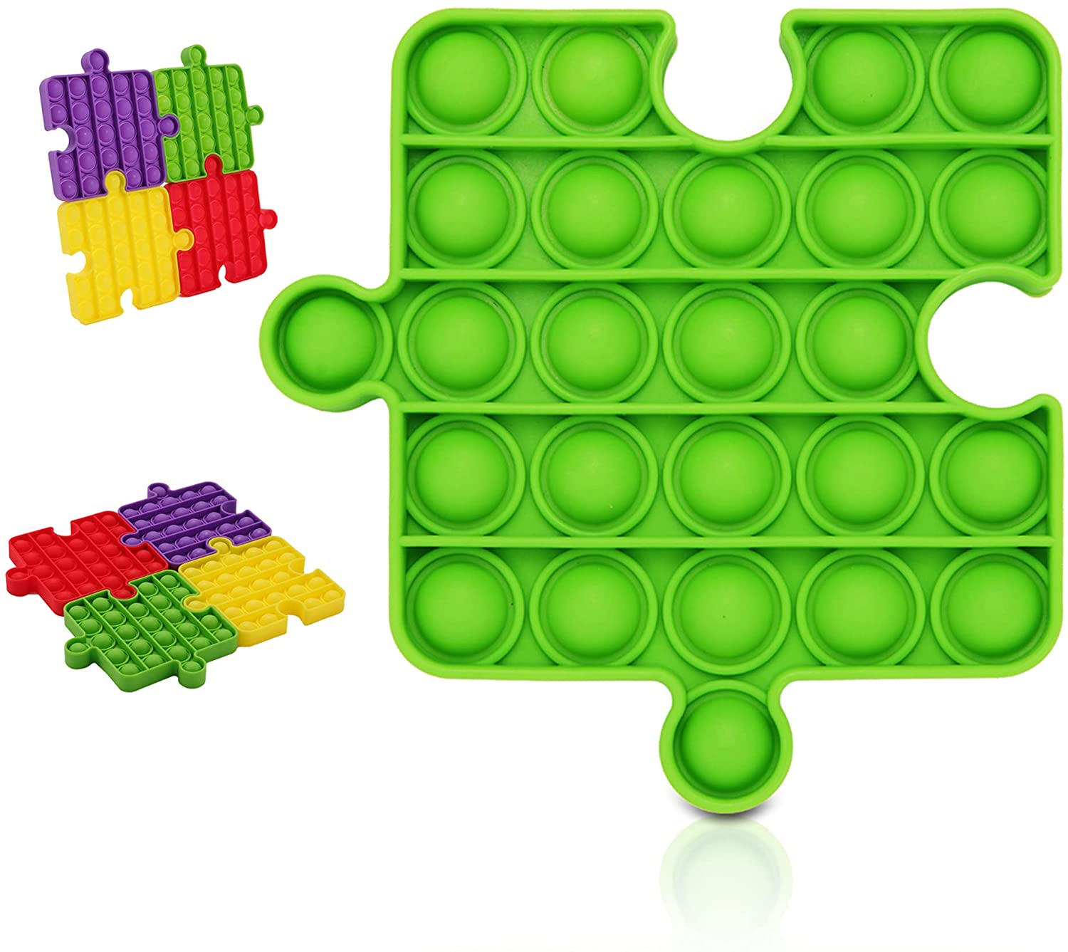 Introducing the Rainbow Puzzle Pop It Set, a delightful assortment of sensory toys designed to engage kids in endless fun! Each piece in this assorted set features a colorful rainbow pattern and a unique puzzle-like shape, inviting kids to explore various tactile sensations and patterns. With the satisfying 'pop' produced by pressing each piece, these sensory toys offer stress relief, tactile stimulation, and imaginative play. Crafted from durable silicone, they are washable, reusable, and perfect for promoting creativity and sensory exploration.