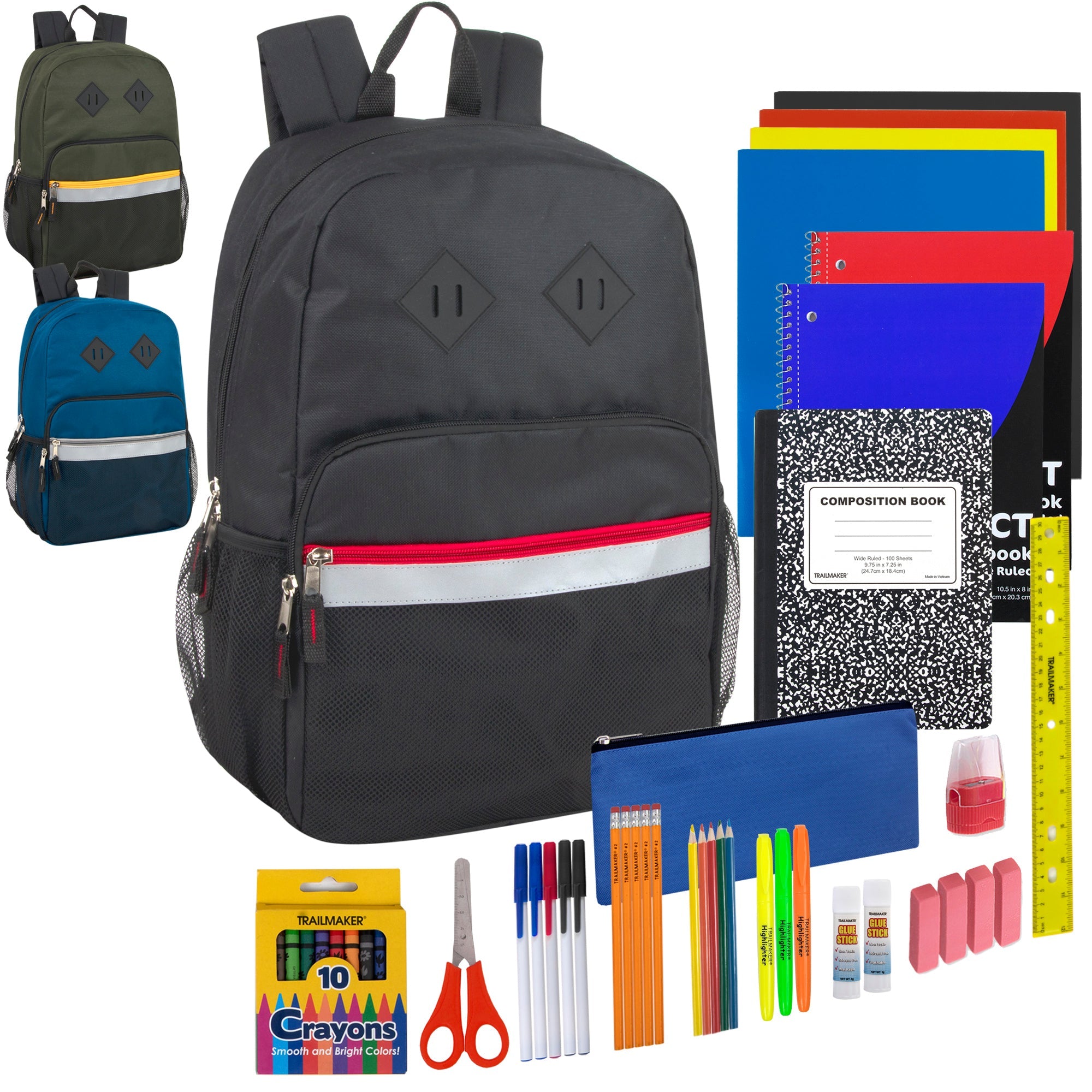 Comprehensive Kit: A 45-piece set, inclusive of 2 spiral notebooks, a composition book, organizer folders, canvas pencil case, ruler, safety scissors, pencils, pens, colored pencils, crayons, pencil sharpener, glue sticks, highlighters, and erasers.