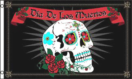 Symbol of Remembrance: The flag features a striking skull adorned with intricate and colorful roses, marigolds, and decorative patterns. It symbolizes the Mexican tradition of honoring and remembering loved ones who have passed away.