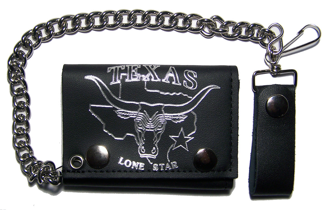 Order your Texas Lone Star Bull and Genuine Leather Tri-Fold Wallet with Chain today and carry a piece of Texas with you wherever you go.
