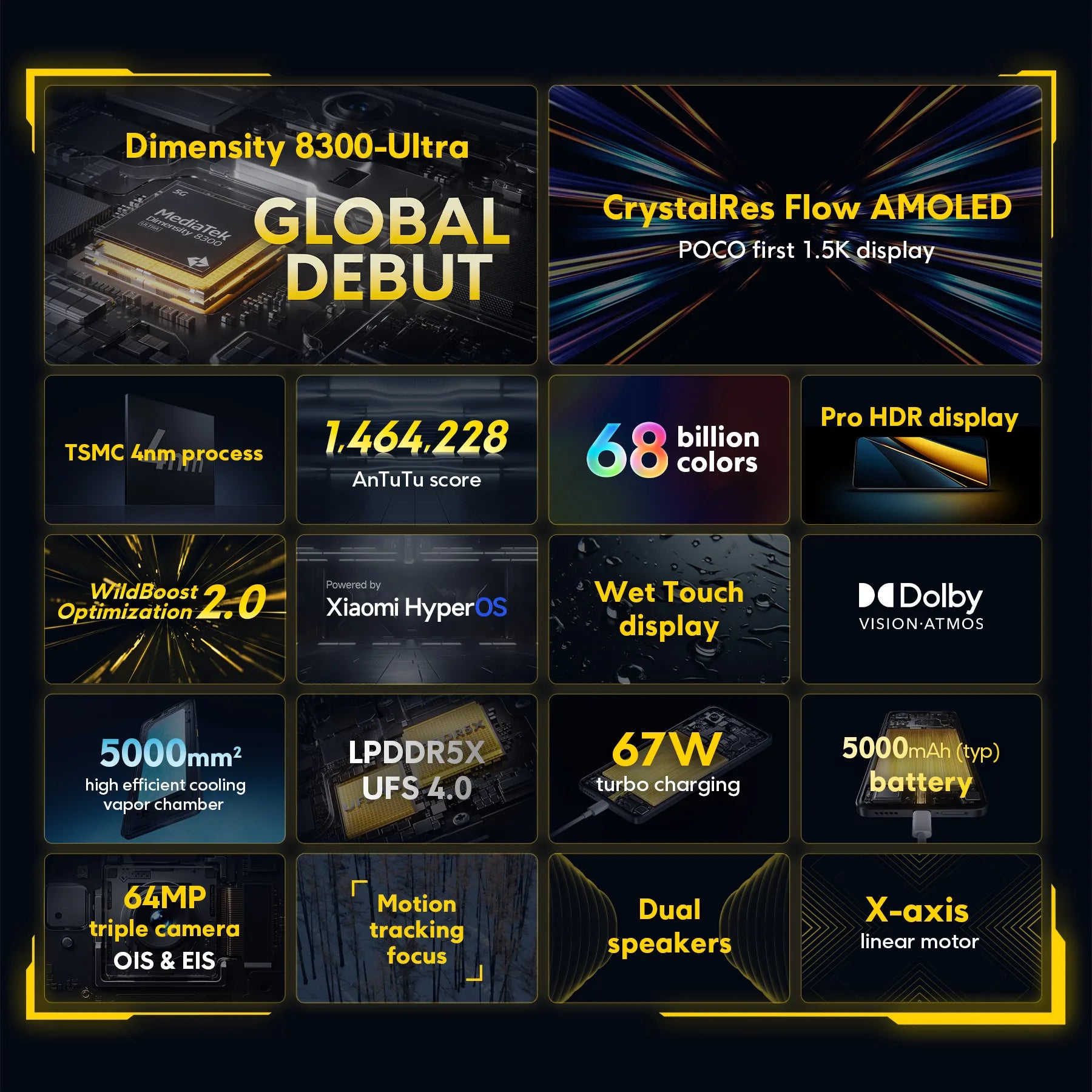 The POCO X6 Pro features a stunning display with a high refresh rate, offering vibrant colors and crystal-clear visuals for an immersive viewing experience.